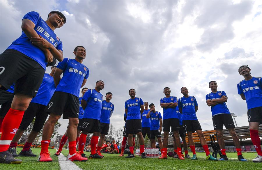 7月8日,亚泰足球俱乐部青训梯队教练员们在赛前。 当日是2020年高考第二天。在位于吉林长春的长春亚泰净月基地,亚泰足球俱乐部各级青训梯队的35名教练员同样迎来了一场特殊的“考试”——与亚泰U15青训梯队的小球员们开展一场实战对抗。教练员们放下“教鞭”,穿上球鞋,与他们的弟子同场竞技,以“足球高考”的方式检验自身专业技能水平。 新华社记者许畅摄