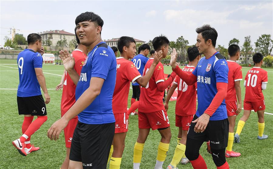 7月8日,亚泰足球俱乐部青训梯队教练员们在开赛前与亚泰U15梯队小球员们相互击掌。 当日是2020年高考第二天。在位于吉林长春的长春亚泰净月基地,亚泰足球俱乐部各级青训梯队的35名教练员同样迎来了一场特殊的“考试”——与亚泰U15青训梯队的小球员们开展一场实战对抗。教练员们放下“教鞭”,穿上球鞋,与他们的弟子同场竞技,以“足球高考”的方式检验自身专业技能水平。 新华社记者许畅摄