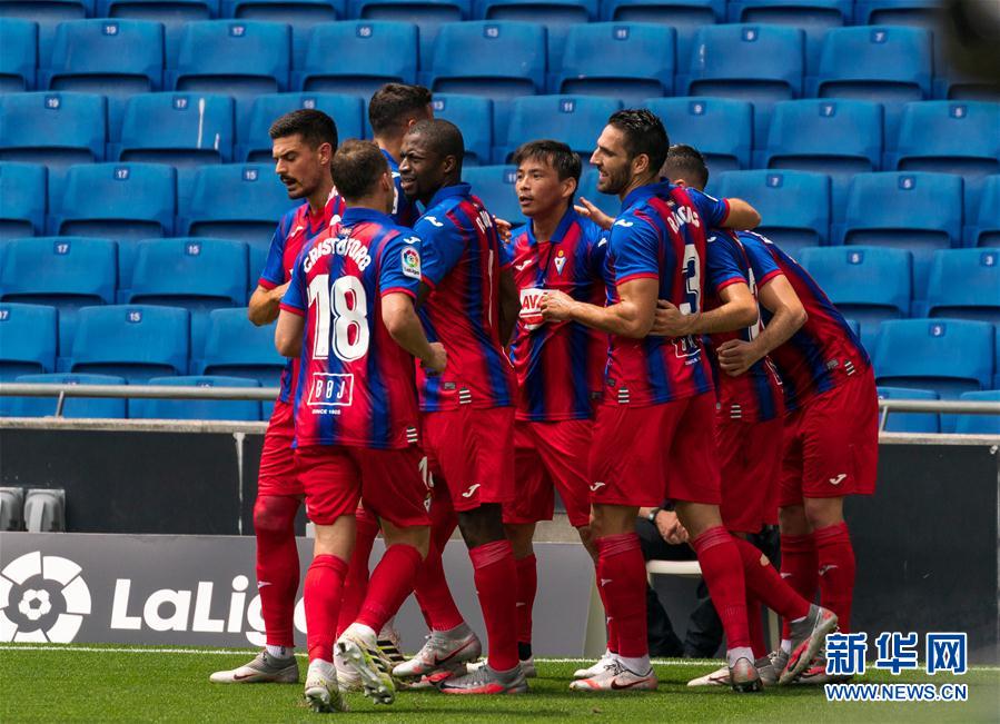 7月12日,埃瓦尔队球员在比赛中庆祝进球。 当日,在2019-2020赛季西班牙足球甲级联赛第36轮比赛中,西班牙人队主场以0比2不敌埃瓦尔队。 新华社发(胡安·戈萨摄)