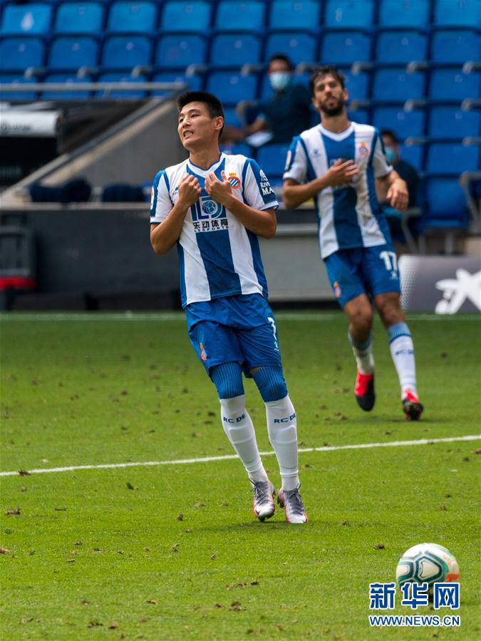 7月12日,西班牙人队球员武磊在比赛中。 当日,在2019-2020赛季西班牙足球甲级联赛第36轮比赛中,西班牙人队主场以0比2不敌埃瓦尔队。 新华社发(胡安·戈萨摄)