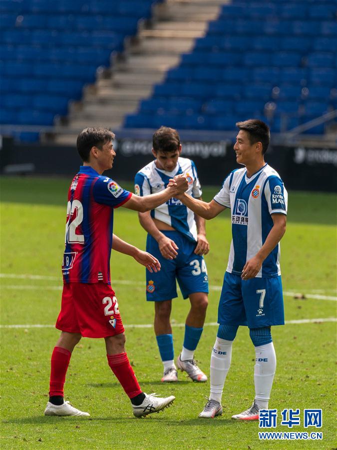 7月12日,西班牙人队球员武磊(右)与埃瓦尔队球员乾贵士在比赛后致意。 当日,在2019-2020赛季西班牙足球甲级联赛第36轮比赛中,西班牙人队主场以0比2不敌埃瓦尔队。 新华社发(胡安·戈萨摄)