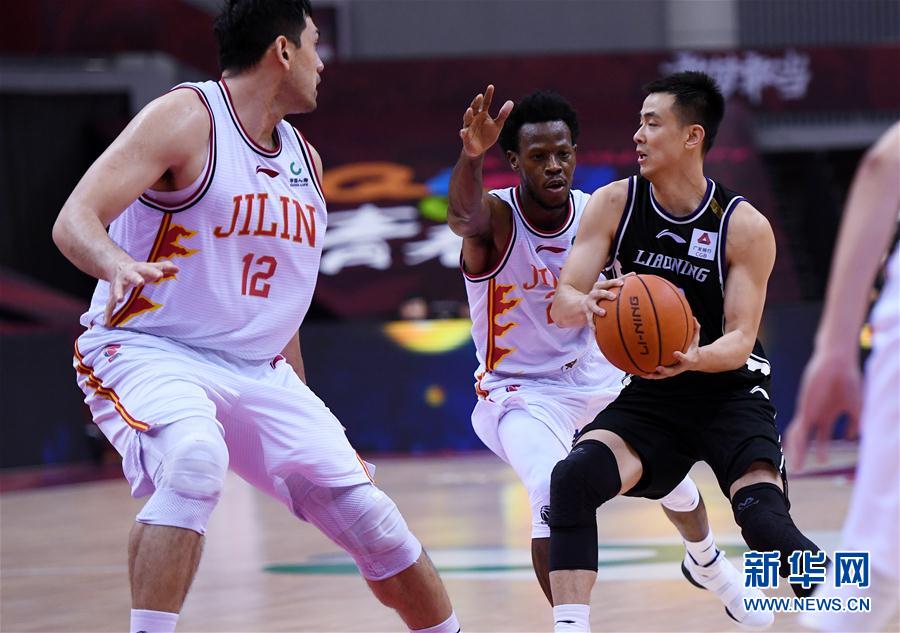 7月15日,吉林九台农商银行队球员肖恩·希尔(中)在比赛中防守辽宁本钢队球员赵继伟(右)。 当日,在山东青岛举行的2019-2020赛季中国男子篮球职业联赛(CBA)复赛第二阶段(崂山赛区)比赛中,辽宁本钢队以125比118战胜吉林九台农商银行队。 新华社记者 李紫恒 摄