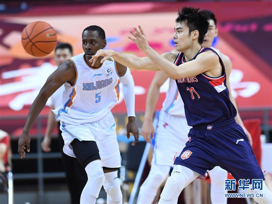 7月23日,时代中国广州队球员贾明儒(右)在比赛中传球。 当日,在山东青岛举行的2019-2020赛季中国男子篮球职业联赛(CBA)复赛第二阶段(红岛赛区)比赛中,新疆伊力特队以103比87战胜时代中国广州队。 新华社记者朱峥摄