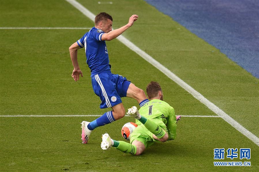 7月26日,莱斯特城队球员瓦尔迪(左)在比赛中和曼联队守门员德赫亚拼抢。 当日,在2019-2020赛季英格兰足球超级联赛第38轮比赛中,曼联队客场以2比0战胜莱斯特城队。 新华社/路透