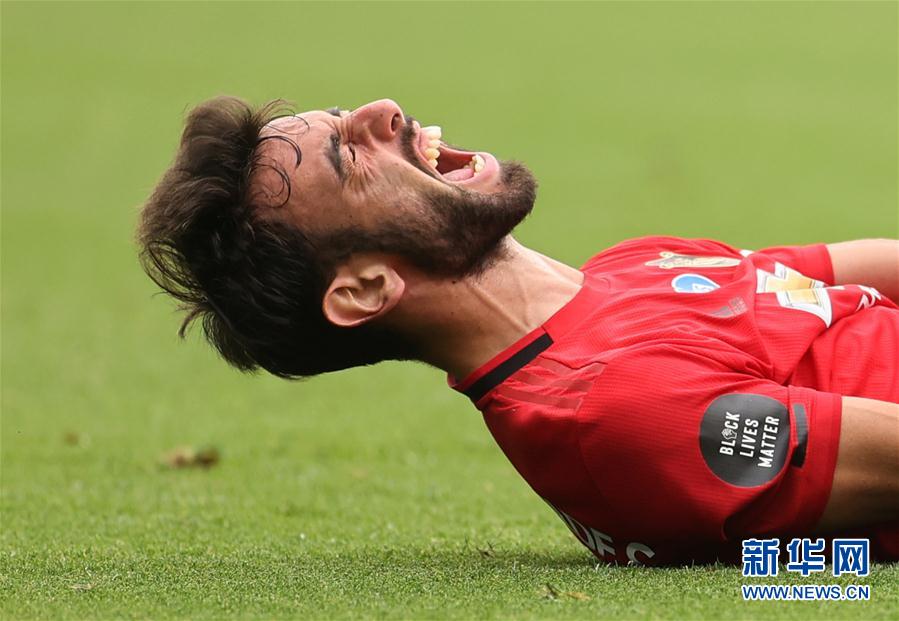 7月26日,曼联队球员布鲁诺·费尔南德斯在比赛中受伤倒地。 当日,在2019-2020赛季英格兰足球超级联赛第38轮比赛中,曼联队客场以2比0战胜莱斯特城队。 新华社/路透