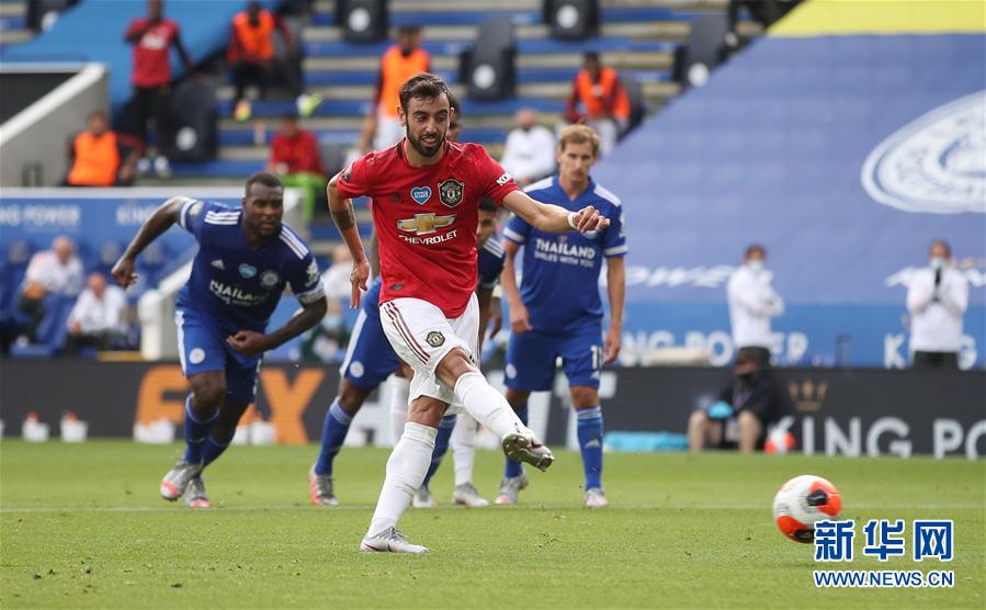 7月26日,曼联队球员布鲁诺·费尔南德斯(前)在比赛中主罚点球命中。 当日,在2019-2020赛季英格兰足球超级联赛第38轮比赛中,曼联队客场以2比0战胜莱斯特城队。 新华社/路透