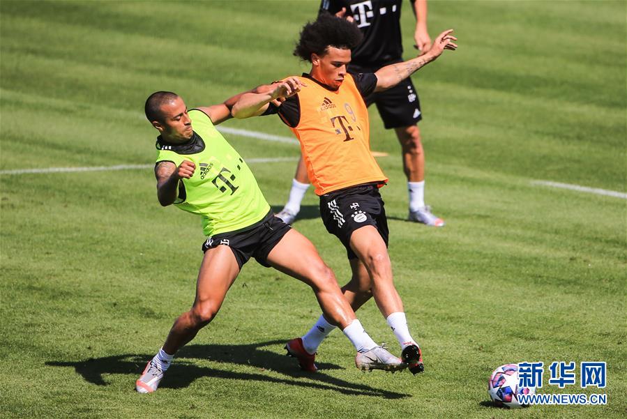 7月28日,拜仁慕尼黑队球员萨内(右)与蒂亚戈在训练中拼抢。 近日,拜仁慕尼黑队在德国慕尼黑恢复球队合练,备战当地时间8月8日与英超切尔西队的欧洲足球冠军联赛八分之一决赛次回合比赛。 新华社发(菲利普·鲁伊兹摄)