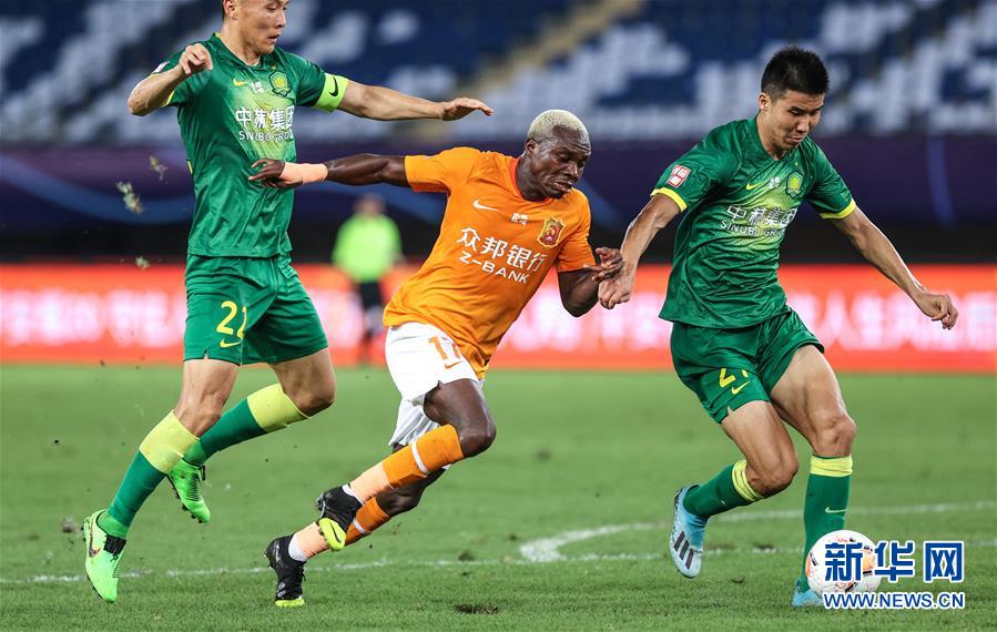 8月1日,北京中赫国安队球员于大宝(左)、王刚(右)在比赛中与武汉卓尔队球员埃弗拉(中)拼抢。 当日,在2020赛季中国足球协会超级联赛第一阶段(苏州赛区)第二轮比赛中,北京中赫国安队以1比0战胜武汉卓尔队。 新华社记者 杨磊 摄