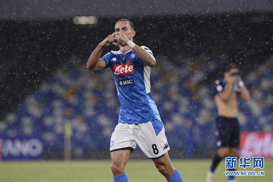 8月1日,那不勒斯队球员法比安·鲁伊斯在进球后庆祝。 当日,在2019-2020赛季意大利足球甲级联赛第38轮比赛中,那不勒斯队主场以3比1战胜拉齐奥队。 新华社/美联