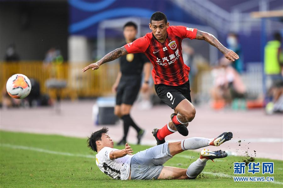 8月2日,上海上港队球员里卡多·洛佩斯(上)在比赛中带球突破河北华夏幸福队球员刘径的防守。 当日,在2020赛季中国足球协会超级联赛第一阶段(苏州赛区)第二轮比赛中,上海上港队以4比0战胜河北华夏幸福队。 新华社记者 李博 摄