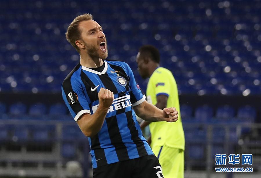 8月5日,国际米兰队球员埃里克森庆祝进球。 当日,在2019/2020赛季欧罗巴联赛八分之一决赛中,意甲国际米兰队以2比0战胜西甲赫塔菲队,晋级八强。 新华社/路透