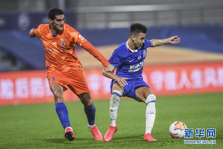 8月5日,上海绿地申花队球员沙拉维(右)在比赛中拼抢。 当日,在2020中国足球协会超级联赛(大连赛区)第三轮比赛中,上海绿地申花队以1比0战胜山东鲁能泰山队。 新华社记者 潘昱龙 摄