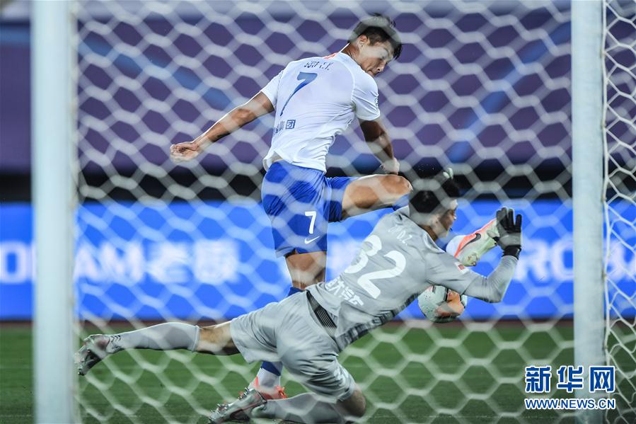 8月9日,山东鲁能泰山队球员郭田雨(上)在比赛中射门。 当日,在2020赛季中国足球协会超级联赛第一阶段(大连赛区)第四轮比赛中,山东鲁能泰山队以1比0战胜广州恒大淘宝队。 新华社记者潘昱龙摄