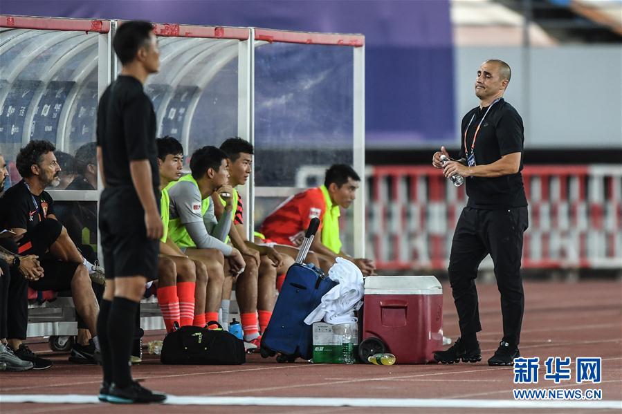 8月9日,广州恒大淘宝队主教练卡纳瓦罗(右一)在比赛中。 当日,在2020赛季中国足球协会超级联赛第一阶段(大连赛区)第四轮比赛中,广州恒大淘宝队以0比1负于山东鲁能泰山队。 新华社记者潘昱龙摄