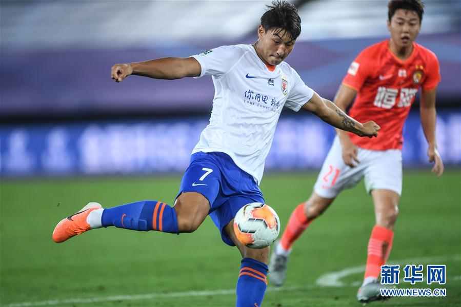 8月9日,山东鲁能泰山队球员郭田雨(左)在比赛中射门得分。 当日,在2020赛季中国足球协会超级联赛第一阶段(大连赛区)第四轮比赛中,山东鲁能泰山队以1比0战胜广州恒大淘宝队。 新华社记者潘昱龙摄