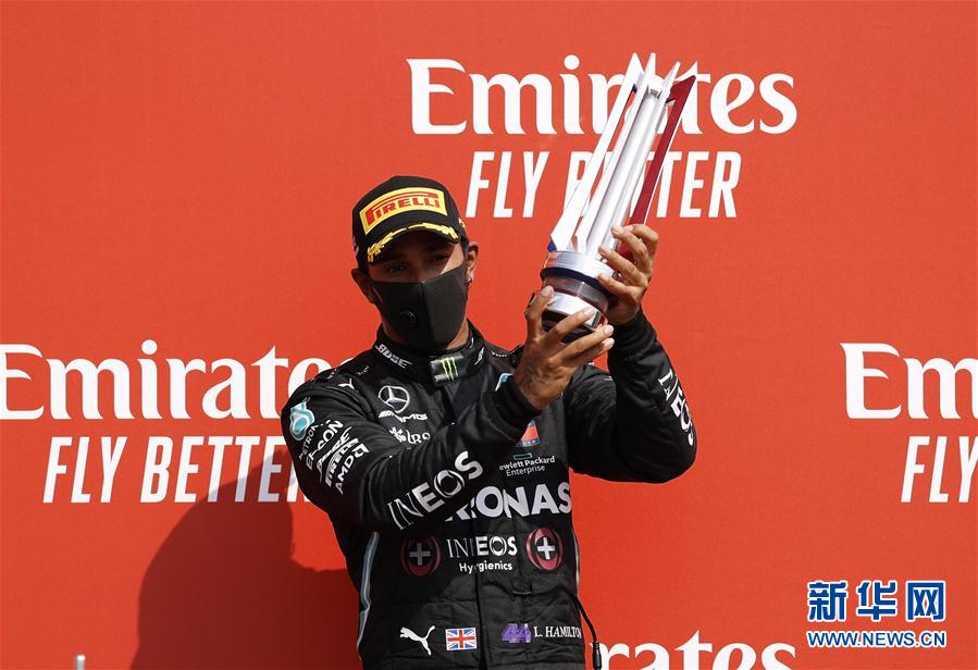 8月9日,汉密尔顿在颁奖仪式上举起奖杯庆祝。 当日,在英国银石赛道进行的2020赛季世界一级方程式锦标赛(F1)七十周年大奖赛正赛中,红牛车队荷兰车手维斯塔潘夺得冠军。梅赛德斯车队英国车手汉密尔顿和芬兰车手博塔斯分获第二、三名。 新华社/路透