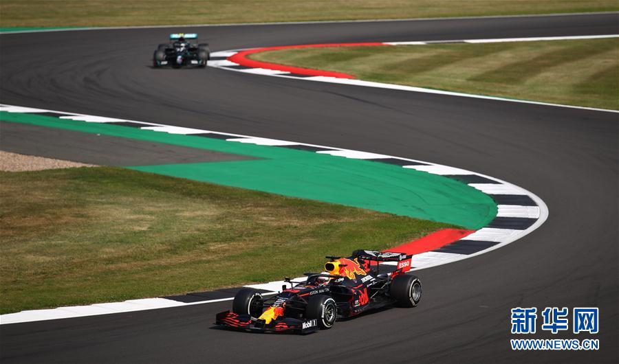 8月9日,维斯塔潘驾驶的赛车(前)在比赛中。 当日,在英国银石赛道进行的2020赛季世界一级方程式锦标赛(F1)七十周年大奖赛正赛中,红牛车队荷兰车手维斯塔潘以1小时19分41秒993的成绩夺得冠军。梅赛德斯车队英国车手汉密尔顿和芬兰车手博塔斯分获第二、三名。 新华社/路透
