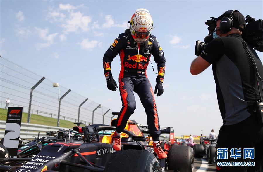 8月9日,维斯塔潘(左)在夺冠后庆祝。 当日,在英国银石赛道进行的2020赛季世界一级方程式锦标赛(F1)七十周年大奖赛正赛中,红牛车队荷兰车手维斯塔潘以1小时19分41秒993的成绩夺得冠军。梅赛德斯车队英国车手汉密尔顿和芬兰车手博塔斯分获第二、三名。 新华社/路透