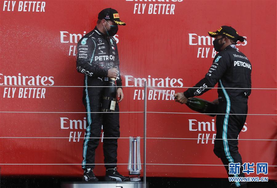 8月9日,博塔斯(左)与汉密尔顿在颁奖仪式上庆祝。 当日,在英国银石赛道进行的2020赛季世界一级方程式锦标赛(F1)七十周年大奖赛正赛中,红牛车队荷兰车手维斯塔潘夺得冠军。梅赛德斯车队英国车手汉密尔顿和芬兰车手博塔斯分获第二、三名。 新华社/路透