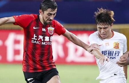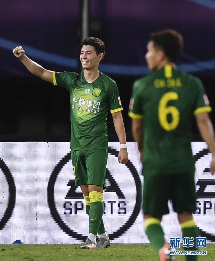 8月12日,北京中赫国安队球员侯永永(左)在比赛中庆祝进球。 当日,在2020赛季中国足球协会超级联赛第一阶段(苏州赛区)第四轮比赛中,北京中赫国安队以3比1战胜河北华夏幸福队。 新华社记者 季春鹏 摄
