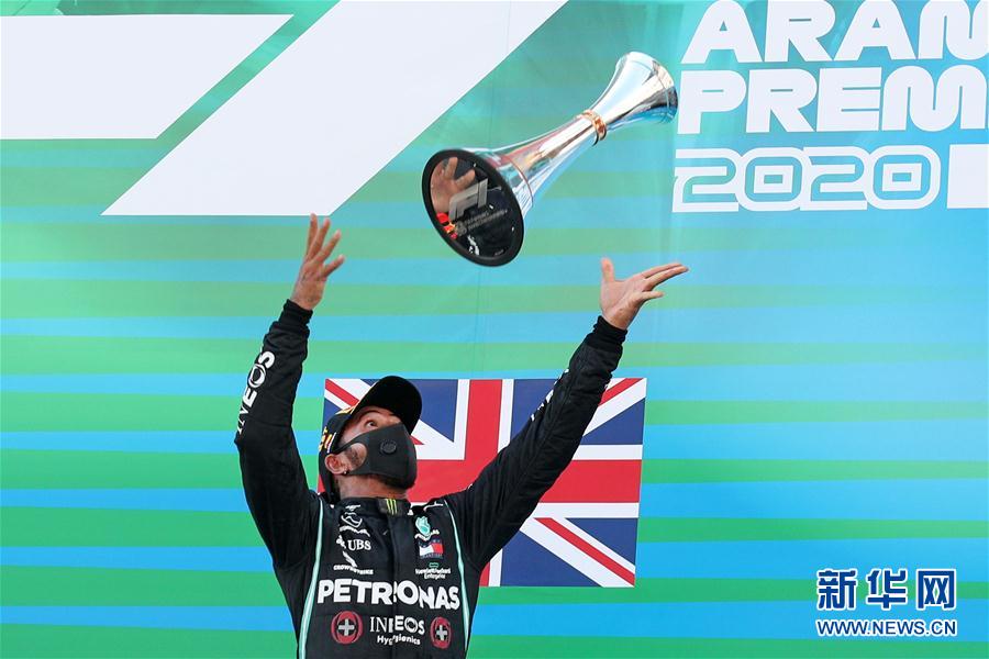 8月16日,梅赛德斯车队英国车手汉密尔顿在颁奖仪式上庆祝。 当日,在西班牙巴塞罗那的加泰罗尼亚赛道举行的2020赛季世界一级方程式锦标赛(F1)西班牙大奖赛中,梅赛德斯车队英国车手汉密尔顿以1小时31分45秒279的成绩夺得冠军。 新华社/法新