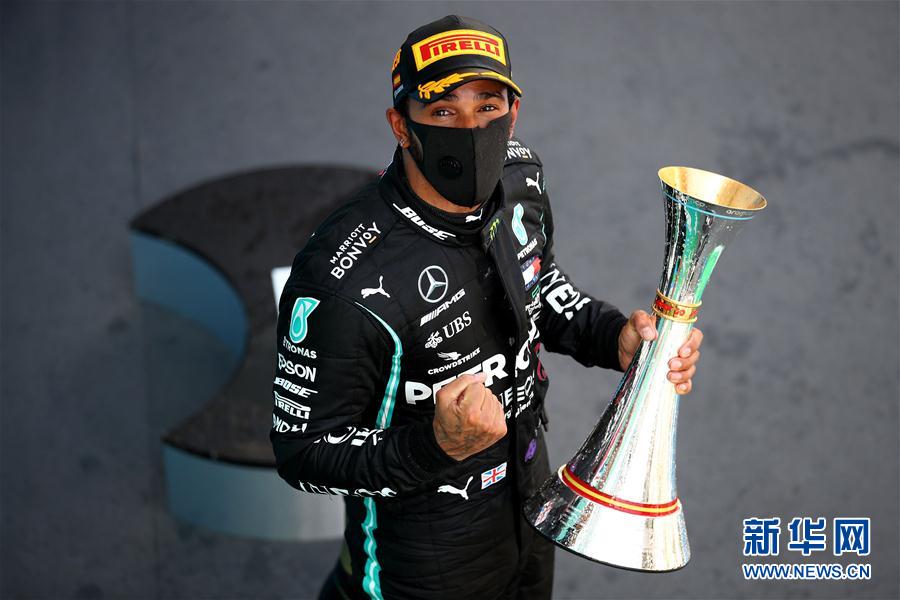8月16日,梅赛德斯车队英国车手汉密尔顿在颁奖仪式上庆祝。 当日,在西班牙巴塞罗那的加泰罗尼亚赛道举行的2020赛季世界一级方程式锦标赛(F1)西班牙大奖赛中,梅赛德斯车队英国车手汉密尔顿以1小时31分45秒279的成绩夺得冠军。 新华社/法新