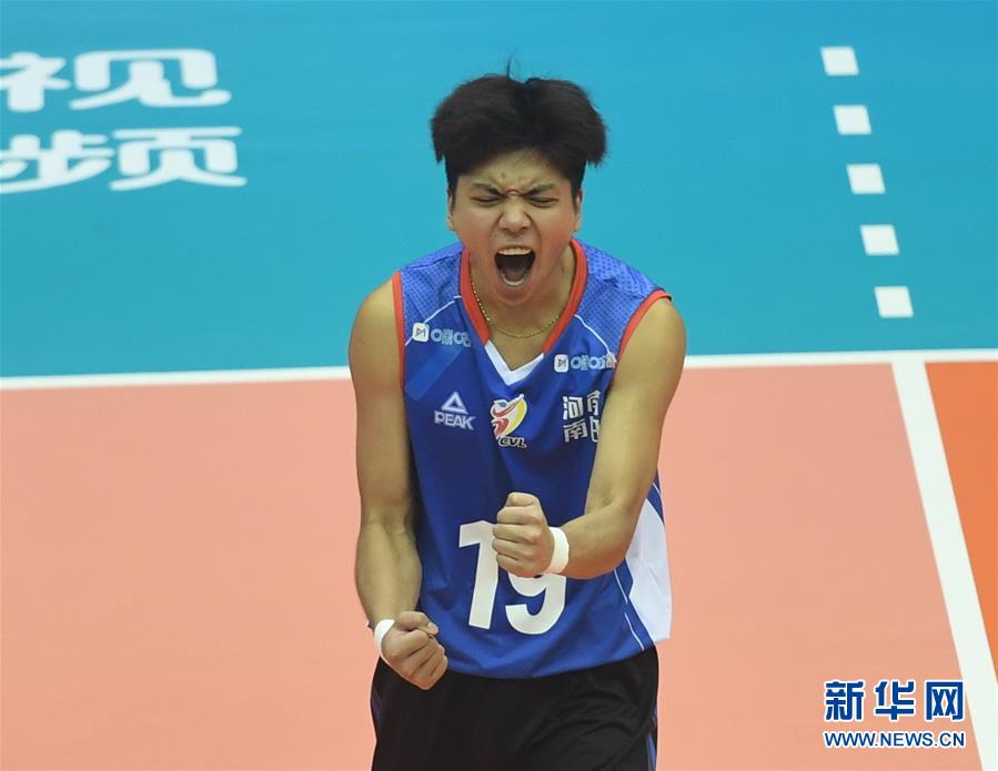8月24日,河南男子排球队球员祁嘉豪在比赛中庆祝。 当日,在河北省秦皇岛进行的2019-2020赛季中国男子排球超级联赛第二阶段E组比赛中,河南男子排球队以2比3不敌四川劲浪体育男子排球队。 新华社记者 朱旭东 摄