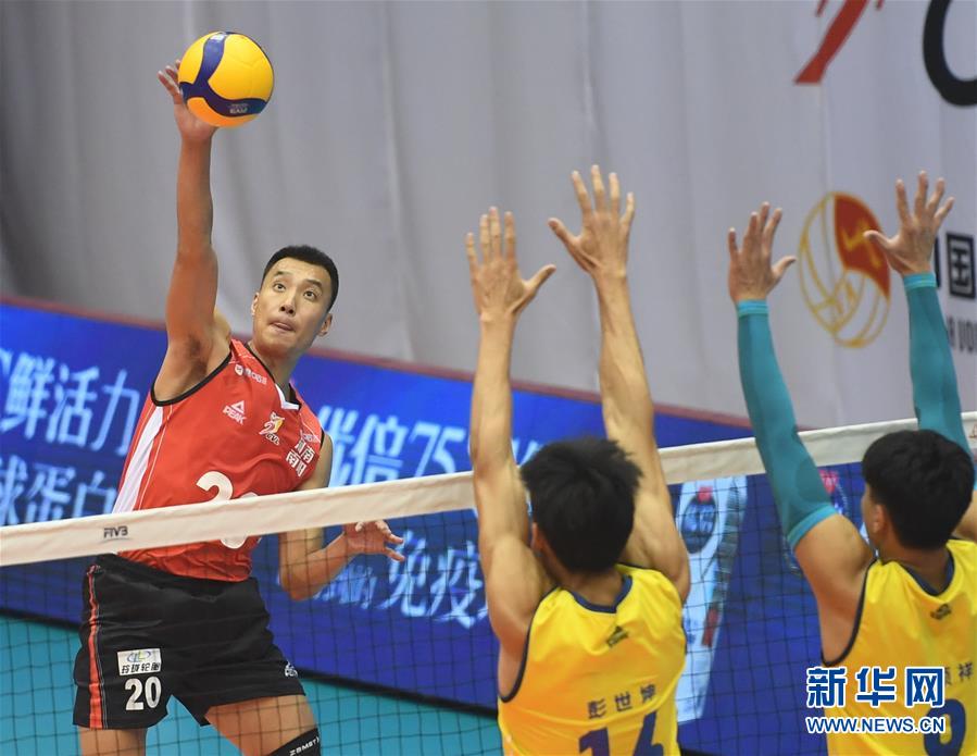 8月24日,河南男子排球队球员崔建军(左)在比赛扣球。 当日,在河北省秦皇岛进行的2019-2020赛季中国男子排球超级联赛第二阶段E组比赛中,河南男子排球队以2比3不敌四川劲浪体育男子排球队。 新华社记者 朱旭东 摄