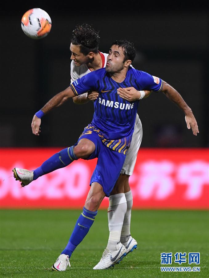 8月24日,江苏苏宁易购队球员埃德尔(前)在比赛中与深圳佳兆业队球员张源争抢头球。 当日,在2020赛季中超联赛第一阶段(大连赛区)第七轮比赛中,深圳佳兆业队以1比1战平江苏苏宁易购队。 新华社记者潘昱龙摄