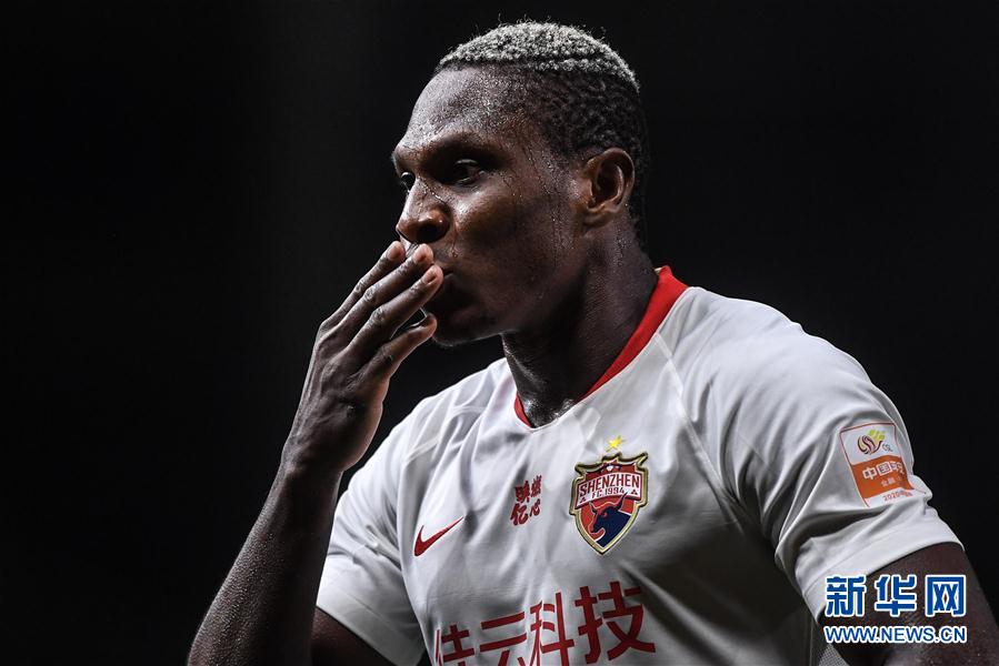 8月24日,深圳佳兆业队球员马里进球后庆祝。 当日,在2020赛季中超联赛第一阶段(大连赛区)第七轮比赛中,深圳佳兆业队以1比1战平江苏苏宁易购队。 新华社记者潘昱龙摄