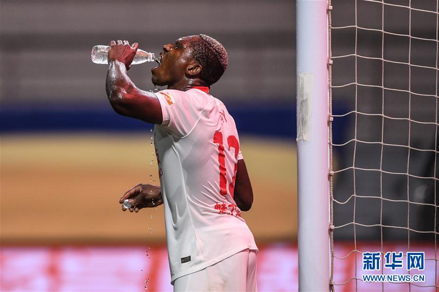 8月24日,深圳佳兆业队球员马里在比赛中补水。 当日,在2020赛季中超联赛第一阶段(大连赛区)第七轮比赛中,深圳佳兆业队以1比1战平江苏苏宁易购队。 新华社记者潘昱龙摄