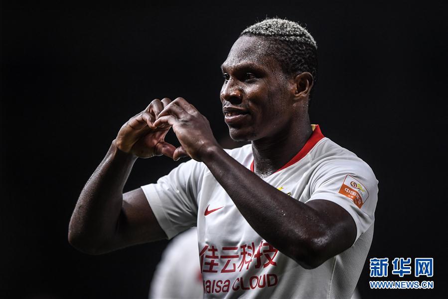8月24日,深圳佳兆业队球员马里进球后庆祝。 当日,在2020赛季中超联赛第一阶段(大连赛区)第七轮比赛中,深圳佳兆业队以1比1战平江苏苏宁易购队。 新华社记者潘昱龙摄