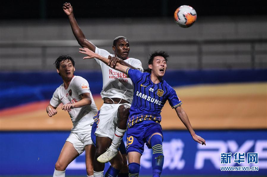 8月24日,深圳佳兆业队球员马里(中)在比赛中头球攻门。 当日,在2020赛季中超联赛第一阶段(大连赛区)第七轮比赛中,深圳佳兆业队以1比1战平江苏苏宁易购队。 新华社记者潘昱龙摄