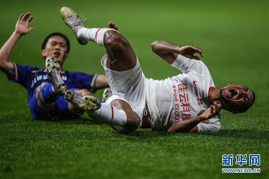 8月24日,深圳佳兆业队球员普雷西亚多(右)在比赛中被铲倒。 当日,在2020赛季中超联赛第一阶段(大连赛区)第七轮比赛中,深圳佳兆业队以1比1战平江苏苏宁易购队。 新华社记者潘昱龙摄