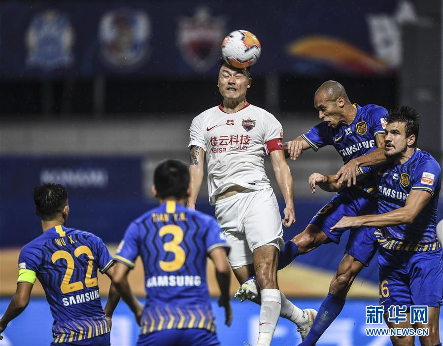 8月24日,深圳佳兆业队球员郜林(中)在比赛中头球攻门。 当日,在2020赛季中超联赛第一阶段(大连赛区)第七轮比赛中,深圳佳兆业队以1比1战平江苏苏宁易购队。 新华社记者潘昱龙摄