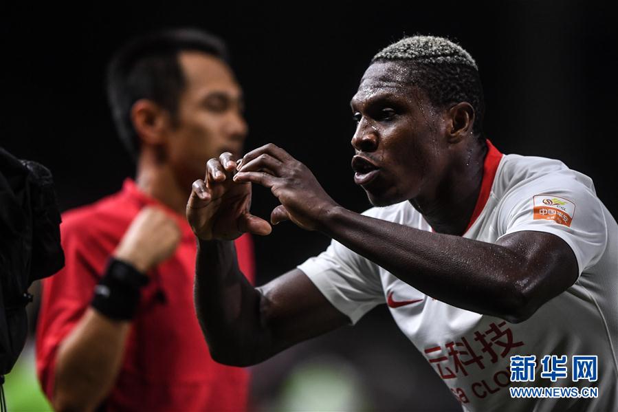 8月24日,深圳佳兆业队球员马里(右)进球后庆祝。 当日,在2020赛季中超联赛第一阶段(大连赛区)第七轮比赛中,深圳佳兆业队以1比1战平江苏苏宁易购队。 新华社记者潘昱龙摄