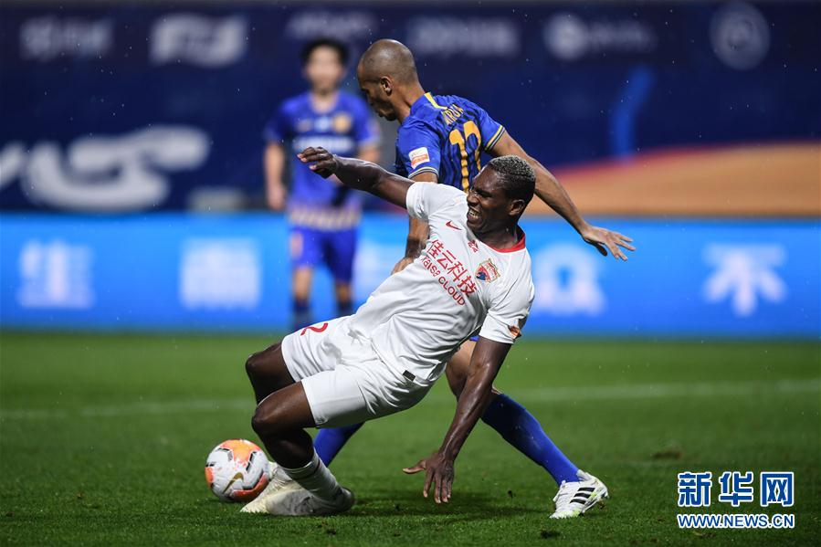 8月24日,深圳佳兆业队球员马里(前)与江苏苏宁易购队球员米兰达在比赛中拼抢。 当日,在2020赛季中超联赛第一阶段(大连赛区)第七轮比赛中,深圳佳兆业队以1比1战平江苏苏宁易购队。 新华社记者潘昱龙摄