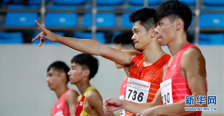 9月15日,浙江队选手谢震业(右二)在起点处向转播镜头致意。最终,他以10秒31的成绩夺得男子100米比赛冠军。 当日,2020年全国田径锦标赛在浙江省绍兴市上虞体育场拉开战幕。 新华社记者 王丽莉 摄