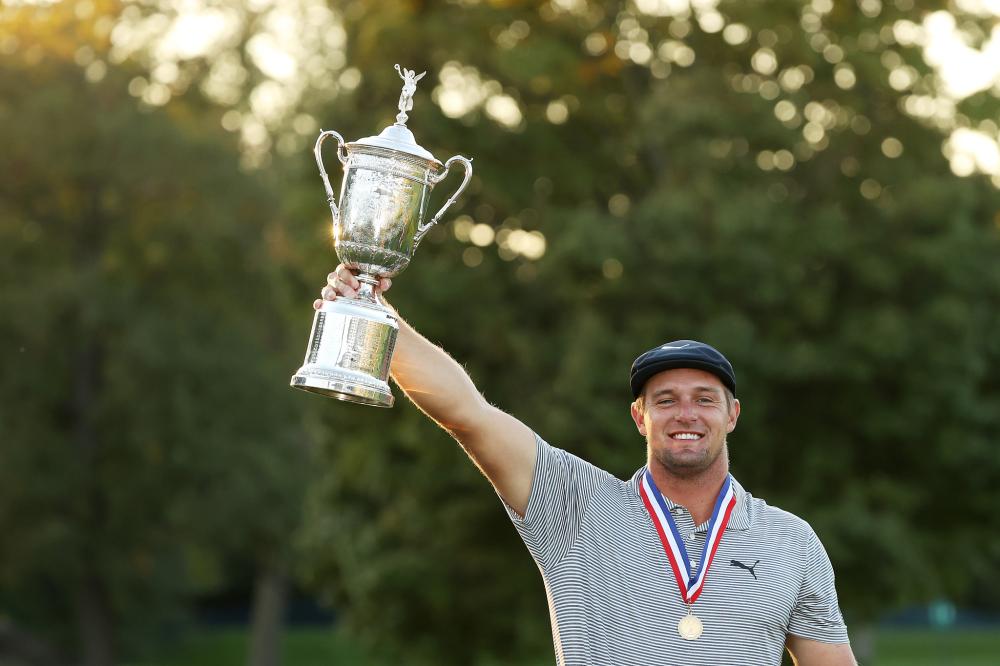 央视网消息:2020年9月20日,美国,2020美国高尔夫公开赛决赛轮,布赖森·德尚博捧杯。