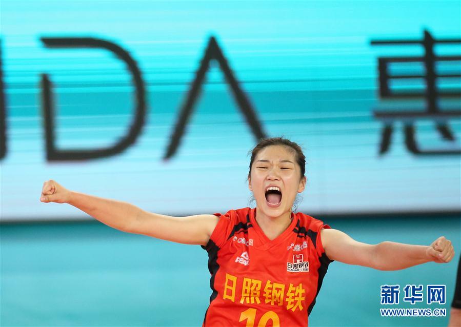 9月29日,山东日照钢铁队球员王梦洁在比赛中庆祝得分。 当日,在广东江门举行的2020年全国女排锦标赛第一阶段B组第五轮比赛中,山东日照钢铁队以3比0战胜河南银鸽投资队。 新华社记者秦朗摄