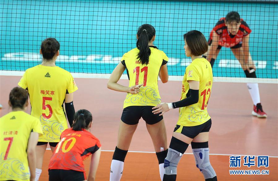 9月29日,山东日照钢铁队球员杨涵玉(右三)在比赛中用手势与队友交流战术。 当日,在广东江门举行的2020年全国女排锦标赛第一阶段B组第五轮比赛中,山东日照钢铁队以3比0战胜河南银鸽投资队。 新华社记者秦朗摄
