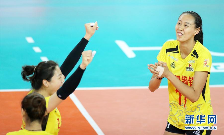 9月29日,山东日照钢铁队球员杨涵玉(右)在比赛中与队友庆祝得分。 当日,在广东江门举行的2020年全国女排锦标赛第一阶段B组第五轮比赛中,山东日照钢铁队以3比0战胜河南银鸽投资队。 新华社记者秦朗摄