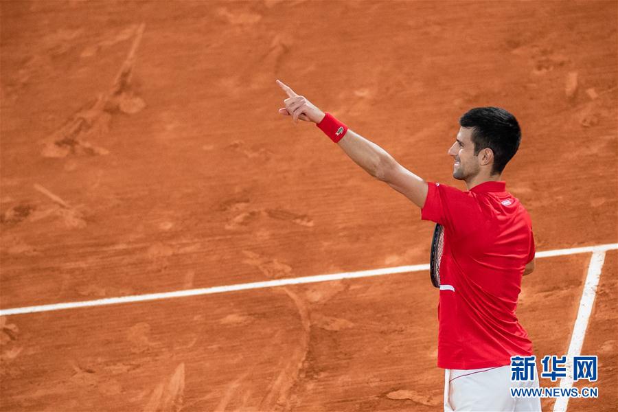 10月9日,焦科维奇庆祝胜利。 当日,在法国巴黎进行的2020年法国网球公开赛男单半决赛中,塞尔维亚选手焦科维奇以3比2战胜希腊选手西西帕斯,晋级决赛。 新华社发(奥雷利安·莫里萨尔摄)