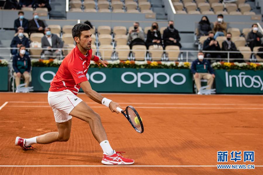 10月9日,焦科维奇在比赛中回球。 当日,在法国巴黎进行的2020年法国网球公开赛男单半决赛中,塞尔维亚选手焦科维奇以3比2战胜希腊选手西西帕斯,晋级决赛。 新华社发(奥雷利安·莫里萨尔摄)