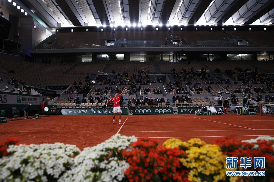 10月11日,焦科维奇在比赛中发球。 当日,在法国巴黎进行的2020年法国网球公开赛男单决赛中,塞尔维亚选手焦科维奇以0比3不敌西班牙选手纳达尔,获得亚军。 新华社记者 高静 摄