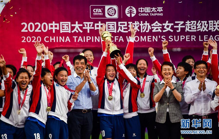10月11日,武汉车都江大队在颁奖仪式上庆祝。 当日,在2020年中国足球协会女子足球超级联赛决赛中,武汉车都江大队以4比0战胜江苏苏宁队,获得冠军。 新华社记者 胡超 摄