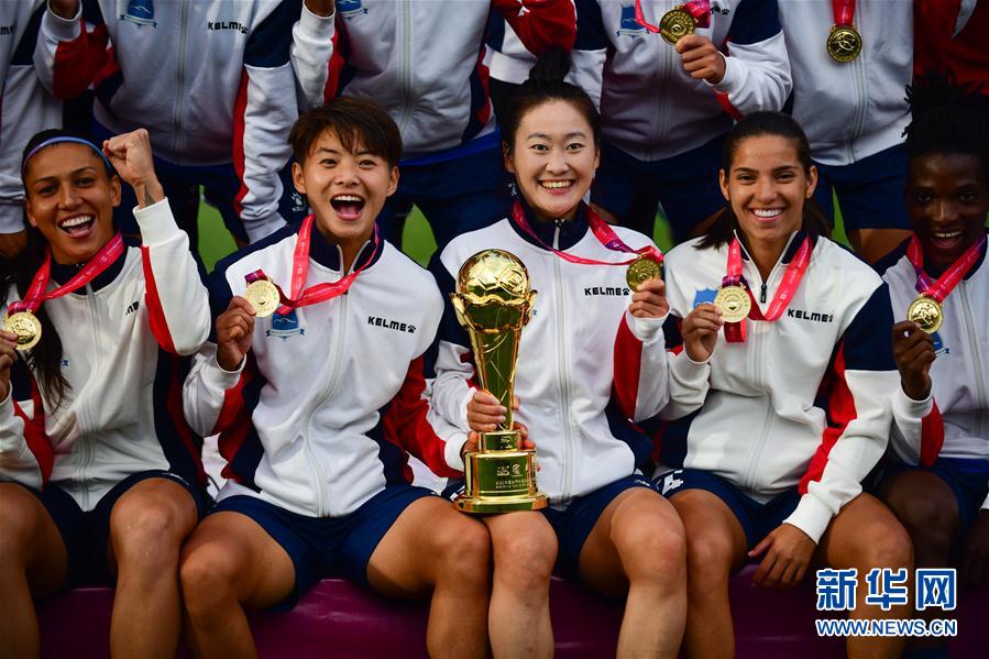 10月11日,武汉车都江大队球员王霜(左二)、吴海燕(中)等在颁奖仪式上合影。 当日,在2020年中国足球协会女子足球超级联赛决赛中,武汉车都江大队以4比0战胜江苏苏宁队,获得冠军。 新华社发(陈欣波摄)