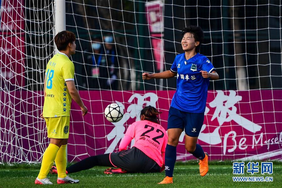 10月11日,武汉车都江大队球员吕悦云(右)进球后庆祝。 当日,在2020年中国足球协会女子足球超级联赛决赛中,武汉车都江大队以4比0战胜江苏苏宁队,获得冠军。 新华社记者 胡超 摄
