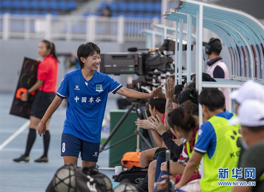 10月11日,武汉车都江大队球员吕悦云(左)下场后与队友击掌。 当日,在2020年中国足球协会女子足球超级联赛决赛中,武汉车都江大队以4比0战胜江苏苏宁队,获得冠军。 新华社发(陈欣波摄)
