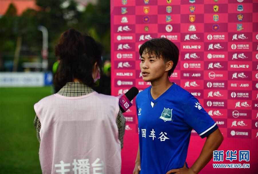 10月11日,武汉车都江大队球员王霜(右)在比赛结束后接受采访。 当日,在2020年中国足球协会女子足球超级联赛决赛中,武汉车都江大队以4比0战胜江苏苏宁队,获得冠军。 新华社发(陈欣波摄)